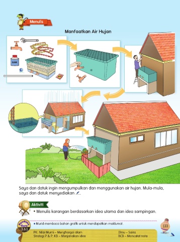 Saya dan datuk ingin mengumpulkan dan menggunakan air hujan. Mula-mula‚