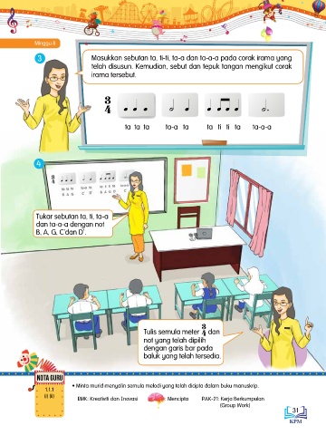• Minta murid menyalin semula melodi yang telah dicipta dalam buku manuskrip.