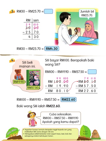 3 RM30 – RM25.70 = Jumlah bil