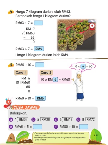 32 • Bimbing murid membahagi nilai wang dengan 10 menggunakan