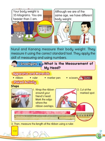 Nurul and Kanang measure their body weight. They