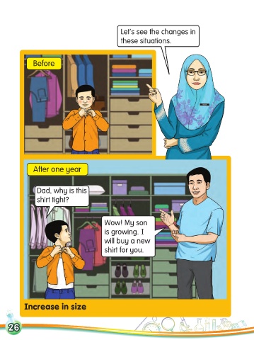 Let’s see the changes in these situations. Before After one year Dad, why is this shirt tight? Wow! My son is growing. I will buy a new shirt for you. Increase in size 26 26 26 UNIT 3_BT.indd 26 11/27/2017 12:02:11 PM