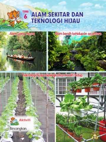 TEMA ALAM SEKITAR DAN 6 TEKNOLOGI HIJAU Alam yang mesra Alam bersih kehidupan sejahtera Teknologi hijau meningkatkan kualiti hidup Aktiviti Bincangkan. 21