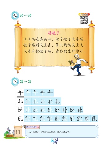 七 读一读 我的扫描 踢毽子 小小鸡毛真美丽,做个毽子大家踢。 毽子踢到天上去,像只蝴蝶天上飞。 大家来把毽子踢,身体健康好学习。 八 写一写 午 北 妹 能 给 老 师的话 话 给 老 师的 4.2.1 (八)根据每个字的笔画和笔顺,写在练习本里。 3.1.1 Saiz sebenar 93