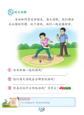 九 短文理解 安安和阿里是好朋友。每天傍晚,他们都会 去公园玩陀螺。玩了游戏,他们一起走路回家。 1 安安和谁一起玩游戏? 。 2 他们每天傍晚会去哪里玩游戏? 。 3 你喜欢玩什么传统游戏?为什么? KBAT 。 话 给 老 师的话 给 老 师的 2.1.1 2.2.1 (九)老师朗读文章,并引导学生回答问题。 3.2.1 Saiz sebenar 94