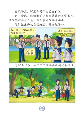 当天早上,阿里和同学坐巴士出发。 到了营地,他们看到小鸟在蓝蓝的天空上飞。 这里的河水分外清,鱼儿在水里游来游去。 他们把东西放在空地后,就分组活动。 来,我们分配工作。 我们去提水。 谁要捡树枝? 我们去 捡树枝。 分配工作后,他们三三两两去捡树枝和提水。 Saiz sebenar 99