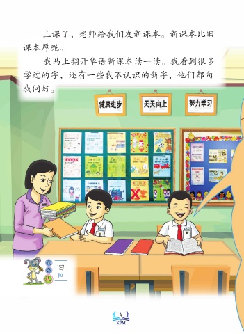 上课了,老师给我们发新课本。新课本比旧 课本厚呢。 我马上翻开华语新课本读一读。我看到很多 学过的字,还有一些我不认识的新字,他们都向 我问好。 我 会 旧 jiX 认 Saiz sebenar 4