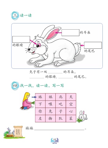 三 读一读 的耳朵 的眼睛 的尾巴 兔子有一双 的耳朵, 的眼睛, 的尾巴。 四 找一找,读一读,写一写 妹 妹 北 天 下 喂 吃 空 你 兔 子 心 左 物 队 菜 妹妹 。 5.3.1 5.5.1 Saiz sebenar 4.1.1 113