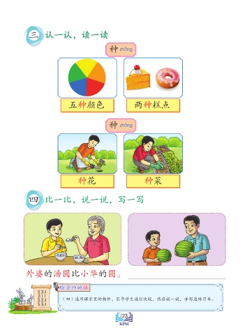 三 认一认,读一读 种 zhQng 五种颜色 两种糕点 种 zhRng 种花 种菜 四 比一比,说一说,写一写 外婆的汤圆比小华的圆。 话 给 老 师的话 给 老 师的 5.3.1 2.1.1 Saiz sebenar 3.2.1 (四)选用课室里的物件,引导学生进行比较,然后说一说,并写进练习本。 5.5.1 123