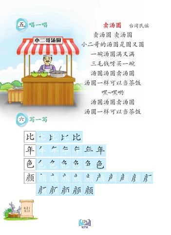 五 唱一唱 卖汤圆 台湾民谣 卖汤圆 卖汤圆 小二哥的汤圆是圆又圆 一碗汤圆满又满 三毛钱呀买一碗 汤圆汤圆卖汤圆 汤圆一样可以当茶饭 嘿~嘿哟 汤圆汤圆卖汤圆 汤圆一样可以当茶饭 六 写一写 比 年 色 颜 4.2.1 3.1.1 Saiz sebenar 124