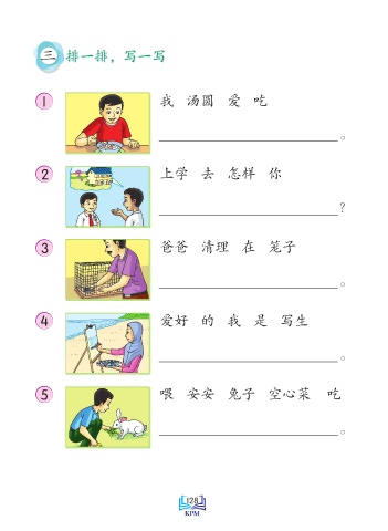 三 排一排,写一写 1 我 汤圆 爱 吃 。 2 上学 去 怎样 你 ? 3 爸爸 清理 在 笼子 。 4 爱好 的 我 是 写生 。 5 喂 安安 兔子 空心菜 吃 。 Saiz sebenar 128
