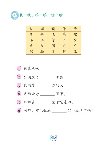 四 找一找,填一填,读一读 天 阅 读 早 喂 洗 安 北 清 理 喜 汤 绿 五 安 比 说 圆 只 兔 家 物 怎 样 乌 1 我喜欢吃 。 2 公园里有 小猫。 3 我的球 你的大。 4 我和哥哥 笼子。 5 木都在 兔子吃东西。 6 老师,可以教我 写中文名字吗? Saiz sebenar 129