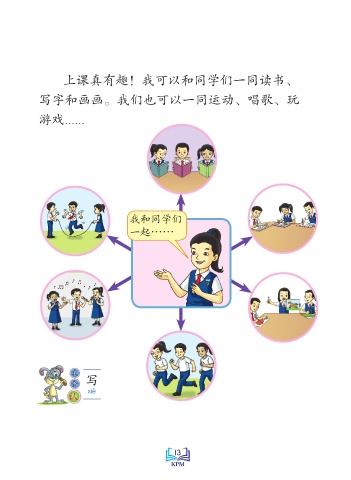 上课真有趣!我可以和同学们一同读书、 写字和画画。我们也可以一同运动、唱歌、玩 游戏...... 我和同学们 一起…… 我 会 写 xiG 认 Saiz sebenar 13