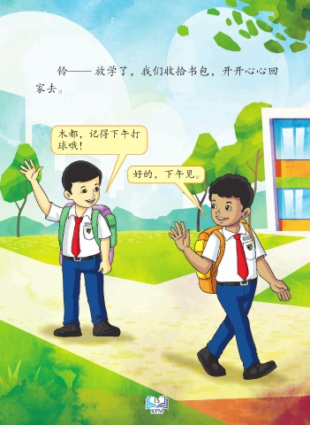 铃—— 放学了,我们收拾书包,开开心心回 家去。 木都,记得下午打 球哦! 好的,下午见。 Saiz sebenar 15