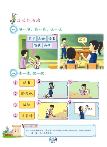 活动加油站 一 演一演,猜一猜,说一说 写字 扫地 读书 写字 唱歌 画画 二 读一读, 配一配 1 读书 a b 2 擦白板 c d 3 扫地 4 排桌椅 话 给 老 师的话 给 老 师的 2.1.1 (一)老师提供字卡,学生看了字卡后轮流在课室前演一演,然后其他同学 4.1.1 Saiz sebenar 猜一猜,说出正确答案。 16