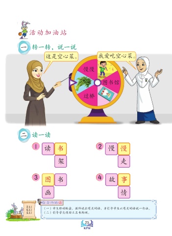 活动加油站 一 转一转,说一说 这是空心菜。 我爱吃空心菜。 慢慢 图书馆 过桥 二 读一读 1 读 书 2 慢 慢 架 走 我讲完故事,同学们拍拍手,说我讲得真动听。 3 图 书 4 故 事 画 情 话 给 老 师的话 给 老 师的 2.1.1 (一)学生转动轮盘,教师说出有关词语,并引导学生以有关词语说一句话。 4.1.1 Saiz sebenar 5.1.1 (二)引导学生借助工具书构词。 25