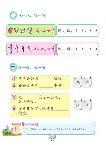 三 找一找,写一写 心 慢 、快、( )、( ) 人 但 、借、( )、( ) 四 选一选,填一填 1 爷爷去公园 运动。 故 做 2 弟弟喜欢看 事书。 3 他 息了一会儿, 就去吃饭。 休 体 4 多吃蔬果可以保持身 健康。 话 给 老 师的话 给 老 师的 2.1.1 Saiz sebenar 5.1.1 (三)引导学生通过部首检字法,找出相同部首的字,并写在练习本。 26
