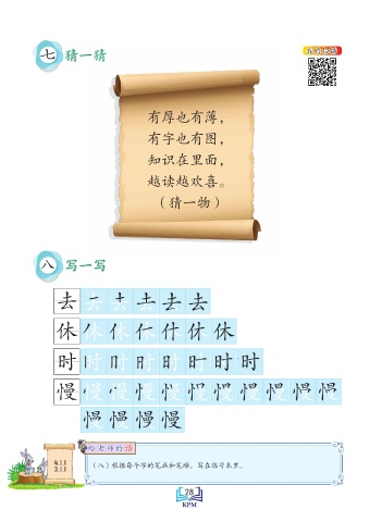 七 猜一猜 我的扫描 有厚也有薄, 有字也有图, 知识在里面, 越读越欢喜。 (猜一物) 八 写一写 去 休 时 慢 话 给 老 师的话 给 老 师的 4.1.1 (八)根据每个字的笔画和笔顺,写在练习本里。 3.1.1 Saiz sebenar 28