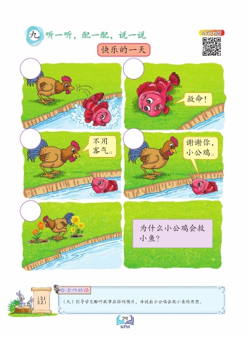 九 听一听,配一配,说一说 我的扫描 快乐的一天 救命! 不用 谢谢你, 客气。 小公鸡。 为什么小公鸡会救 小鱼? 话 给 老 师的话 给 老 师的 1.3.1 Saiz sebenar 3.2.1 (九)引导学生聆听故事后排列图片,并说出小公鸡会救小鱼的原因。 29