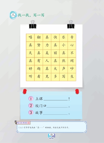 三 找一找,写一写 唱 翻 真 快 乐 专 真 努 力 真 小 心 天 真 美 丽 真 不 真 有 人 真 热 闹 好 趣 真 大 声 吵 听 看 见 多 写 生 1 上课 ! 2 校门口 。 3 故事 。 话 给 老 师的话 给 老 师的 (三)引导学生找出“真……”的短语,然后完成下列句子。 Saiz sebenar 32