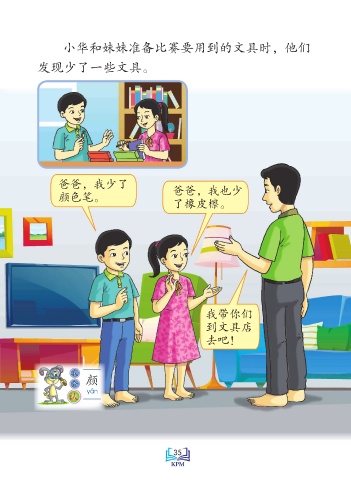 小华和妹妹准备比赛要用到的文具时,他们 发现少了一些文具。 爸爸,我少了 爸爸,我也少 颜色笔。 了橡皮檫。 我带你们 到文具店 去吧! 我 会 颜 yBn 认 Saiz sebenar 35