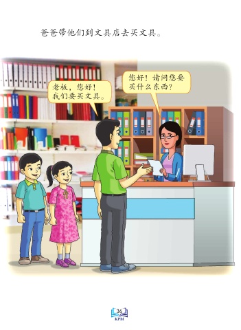 爸爸带他们到文具店去买文具。 您好!请问您要 老板,您好! 买什么东西? 我们要买文具。 Saiz sebenar 36