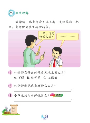 八 短文理解 放学前,林老师看见地上有一支铅笔和一把 尺。老师把那些文具拿起来。 小华,这是 谁的文具? ……………… 1 林老师在什么时候看见地上有文具? A. 下课 B. 放学前 C. 上课前 2 林老师看见地上有什么文具? 。 3 小华应该向老师说什么? KBAT 。 2.2.1 3.2.1 Saiz sebenar 5.5.1 42