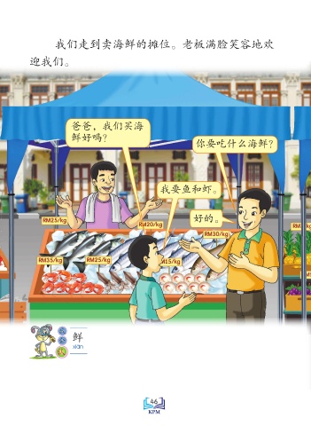 我们走到卖海鲜的摊位。老板满脸笑容地欢 迎我们。 爸爸,我们买海 鲜好吗? 你要吃什么海鲜? 我要鱼和虾。 好的。 我 会 鲜 xiAn 认 Saiz sebenar 46