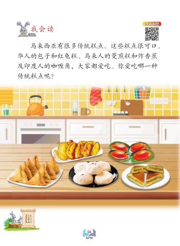 我的扫描 我会读 马来西亚有很多传统糕点。这些糕点很可口。 华人的包子和红龟糕、马来人的曼煎糕和炸香蕉 及印度人的咖喱角,大家都爱吃。你爱吃哪一种 传统糕点呢? 2.1.1 2.2.1 5.5.1 Saiz sebenar 54