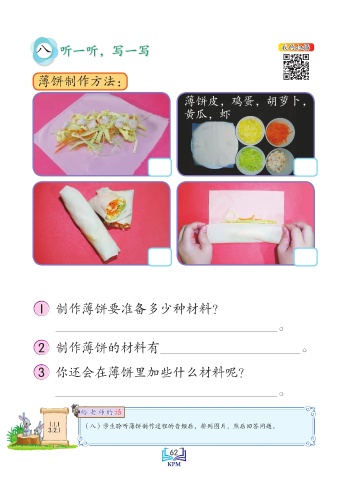 八 听一听,写一写 我的扫描 薄饼制作方法: 薄饼皮,鸡蛋,胡萝卜, 黄瓜,虾 1 制作薄饼要准备多少种材料? 。 2 制作薄饼的材料有 。 3 你还会在薄饼里加些什么材料呢? 。 话 给 老 师的话 给 老 师的 1.1.1 (八)学生聆听薄饼制作过程的音频后,排列图片,然后回答问题。 3.2.1 Saiz sebenar 62