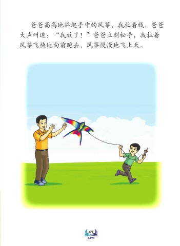 爸爸高高地举起手中的风筝,我拉着线,爸爸 大声叫道:“我放了!”爸爸立刻松手,我拉着 风筝飞快地向前跑去,风筝慢慢地飞上天。 Saiz sebenar 69