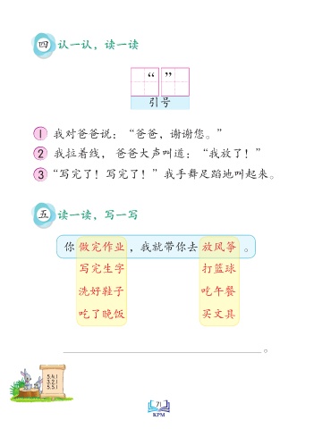 四 认一认,读一读 “ ” 引号 1 我对爸爸说:“爸爸,谢谢您。” 2 我拉着线, 爸爸大声叫道:“我放了!” 3 “写完了!写完了!”我手舞足蹈地叫起来。 五 读一读,写一写 你 做完作业 ,我就带你去 放风筝 。 写完生字 打篮球 洗好鞋子 吃午餐 吃了晚饭 买文具 。 5.4.1 3.2.1 Saiz sebenar 5.5.1 71