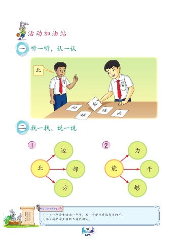活动加油站 一 听一听,认一认 北 二 找一找,说一说 1 2 边 力 北 部 能 干 方 够 给 老 师的话 话 给 老 师的 2.1.1 (一)一个学生读出一个字,另一个学生举起有关的字。 4.1.1 Saiz sebenar 5.1.1 (二)引导学生借助工具书构词。 90