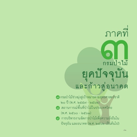 กรมป่าไม้ และก้าวสู่อนาคต ๗ กรมป่าไม้ช่วงมุ่งสู่เป้าหมายตามยุทธศาสตร์ชาติ ๒๐ ปี (พ.ศ. ๒๕๕๗ - ๒๕๖๒) ี ๘ สถานการณ์พ้นท่ป่าไม้ในประเทศไทย ื (พ.ศ. ๒๕๖๐ - ๒๕๖๑) ๙ การบริหารงานจัดการป่าไม้เพื่อความย่งยืนใน ั ปัจจุบัน และอนาคต (พ.ศ. ๒๕๖๒ เป็นต้นไป) 71