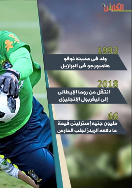 1992 ولد فى مدينة نوفو هامبورجو فى البرازيل 2018 انتقل من روما الإيطالى إلى ليفربول الإنجليزى 66 مليون جنيه إسترلينى قيمة ما دفعه الريدز لجلب الحارس