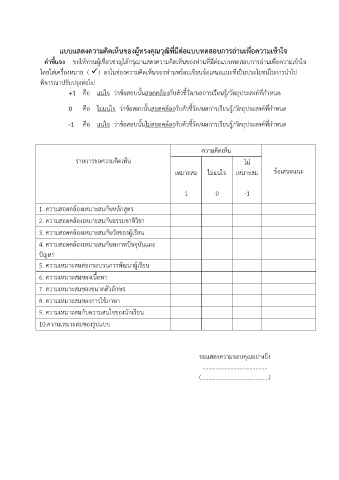 คำชี้แจง ขอให้ท่านผู้เชี่ยวชาญได้กรุณาแสดงความคิดเห็นของท่านที่มีต่อแบบทดสอบการอ่านเพอความเข้าใจ
