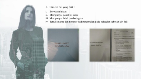 1. Ciri-ciri fail yang baik : i. Berwarna hitam ii. Mempunyai poket lut sinar iii. Mempunyai label pembahagian iv. Tertulis nama dan nombor kad pengenalan pada bahagian sebelah kiri fail