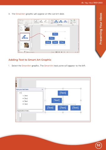 The City School 2021-2022 3. The SmartArt graphic will appear on the current slide. Presenting Your Ideas Adding Text to Smart Art Graphic 1. Select the SmartArt graphic. The SmartArt task pane will appear to the left. 53