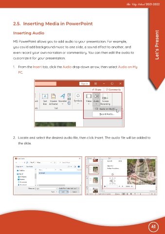 1. From the Insert tab, click the Audio drop-down arrow, then select Audio on My