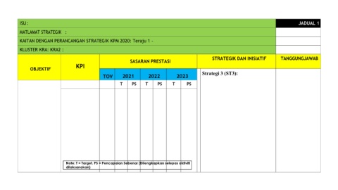 Note: T = Target. PS = Pencapaian Sebenar (Dilengkapkan selepas aktiviti