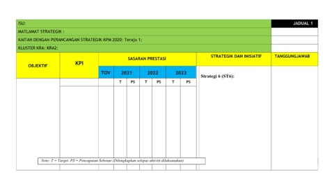 Note: T = Target. PS = Pencapaian Sebenar (Dilengkapkan selepas aktiviti dilaksanakan)