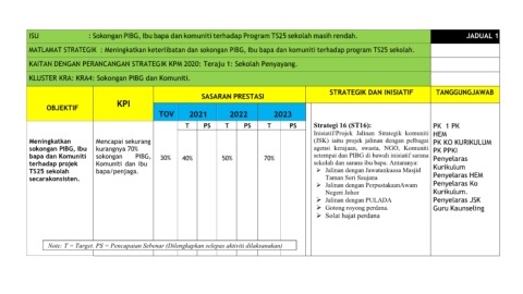 Note: T = Target. PS = Pencapaian Sebenar (Dilengkapkan selepas aktiviti dilaksanakan)