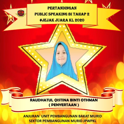PERTANDINGAN PUBLIC SPEAKING BI TAHAP 2 #JEJAK JUARA KL 2020 RAUDHATUL QISTINA BINTI OTHMAN ( PENYERTAAN ) ANJURAN UNIT PEMBANGUNAN BAKAT MURID SEKTOR PEMBANGUNAN MURID JPWPKL
