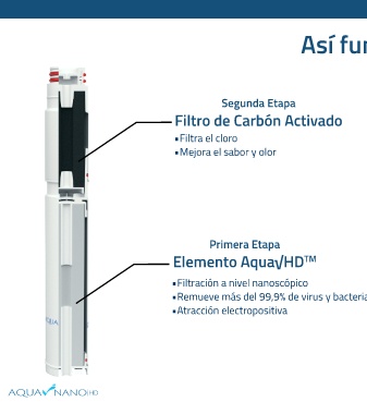 Así fun Segunda Etapa Filtro de Carbón Activado • Filtra el cloro • Mejora el sabor y olor Primera Etapa Elemento AquavHDTM • Filtración a nivel nanoscópico • Remueve más del 99,9% de virus y bacteria • Atracción electropositiva