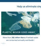 Help us eliminate sing PLASTIC NEVER GOES AWAY More than 282 billion liters of bottled water are consumed annually worldwide1.