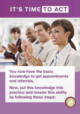 IT’S TIME TO ACT You now have the basic knowledge to get appointments and referrals. Now, put this knowledge into practice and master this ability by following these steps: