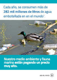 Cada año, se consumen más de 282 mil millones de litros de agua embotellada en en el mundo . 1 2 Nuestro medio ambiente y fauna marina están pagando un precio muy alto. VEA EL VIDEO
