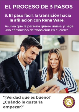 EL PROCESO DE 3 PASOS 3. El paso fácil, la transición hacia la afiliación con Rena Ware. Asuma que la persona quiere unirse, y haga una afirmación de transición en el cierre. “¿Verdad que es bueno? ¿Cuándo le gustaría empezar?”