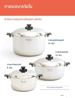 ภาชนะขนาดจัมโบ สำ�หรับการปรุงขนาดใหญ่อย่างแท้จริง ภาชนะซูเปอร์เดอลุกซ์ 16�ลิตร ภาชนะคิงคุกเกอร์� 12�ลิตร ภาชนะควีนคุกเกอร์ 8�ลิตร มีจำ หน่ายในรูปแบบเป็นเซตด้วย 7