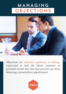 MANAGING OBJECTIONS Objections are concerns, questions, or feelings (expressed or not) the future customer or potential recruit has, that may prevent you from obtaining a presentation appointment.